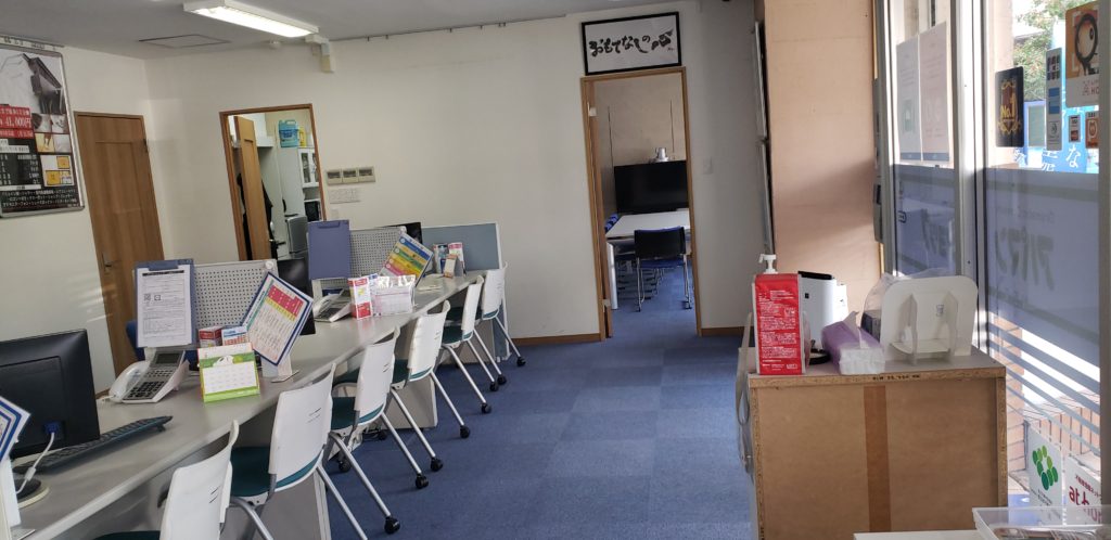 タチカワブリアンドのラインドレープをオフィスとの間仕切りに使いました、ターコイズブルーが良くマッチしています。このラインドレープは両サイドバトン式で両サイドからバトンを使ってスラットが動かせますので、オフィスとの行き来が楽にできます。
